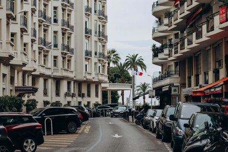 Cannes, France - 30 June 2023: Street overlooking the Croisette, part of the facade of the Hotel Martinez