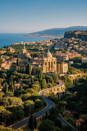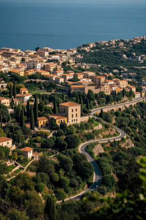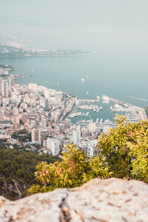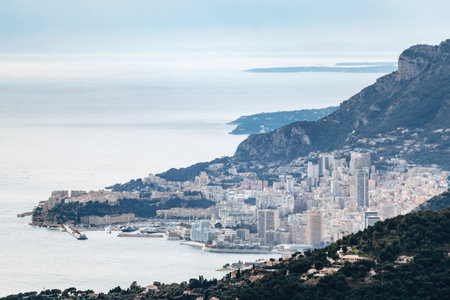View of the Principality of Monaco from the mountains on the border between France and Italy, showcasing the coastal city and surrounding landscape