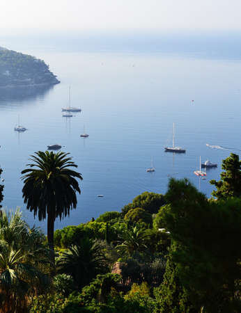 An elevated view down onto Eze-sur-Mer and the azure blue Mediterranean with a spiky palm in the foreground