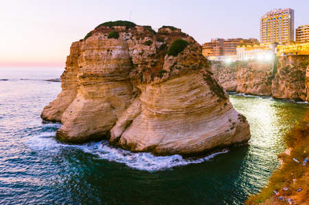 Beautiful sunset on Raouche, Pigeons Rock. In Beirut, Lebanon.Sun and Stones are reflected in water.dense clouds in the sky.