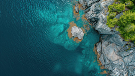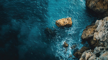 Top-down image of a rocky shore meeting the sea, with stunning blue waters and summer vacation vibes, ideal for background or wallpaper use.
