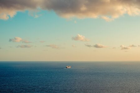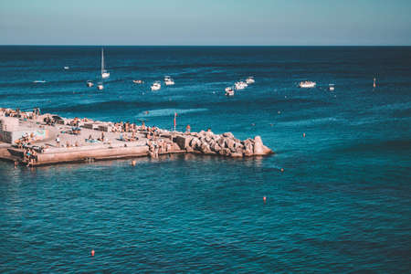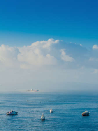 Boats the background of the sea and blue sky with beautiful clouds, minimalism, gulf of Napoli, Mediterranean sea, Italy