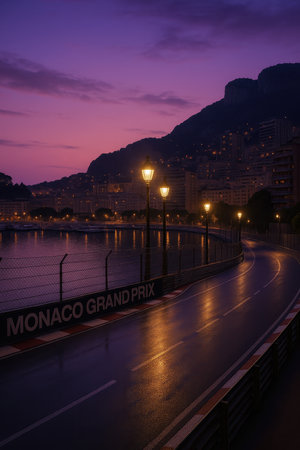 Night view of Monaco Grand Prix circuit with event name visible on track, illuminated by streetlights reflecting on wet surface. Concept of sport, race, competition.