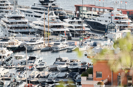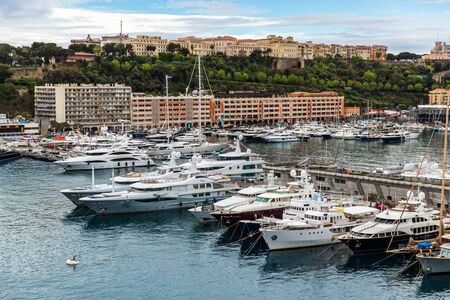 A lot of huge yachts are in port of Monaco at sunny day, megayachts are moored in marina, is a yacht show, Monte Carlo, real estate housing is on background, glossy board of the motor boat