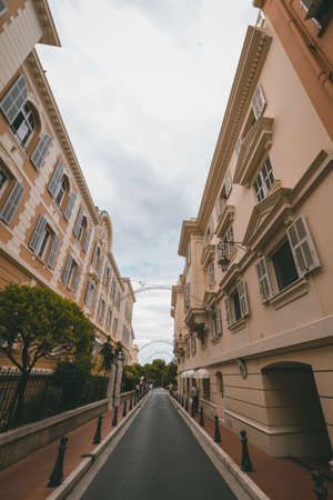Monte Carlo, Monaco - September 23, 2018: Street near the world famous Monte Carlo casino in Monaco at a cloudy day