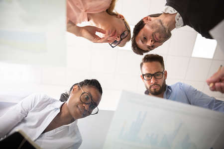 Close up of diverse startup company colleagues meeting in professional workplace, brifing and sharing ideas over financial strategy management. Multiracial business people working together at office.
