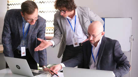 Three men in suits and glasses are conferring in a conference room. Businessmen are looking at laptops and working on a common project. Teamwork. Team building
