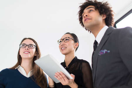Happy business colleagues using digital tablet while standing in a office