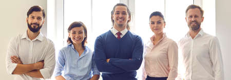 Portrait of a successful creative business team looking at camera and smiling standing sunlight backlit by the window. Concept of a company with happy employees, friendly staff, and corporate culture