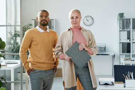 Team of multi-ethnic office colleagues standing in open space office and looking at camera