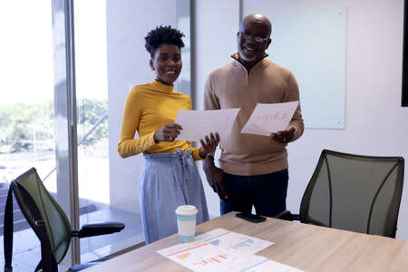 Portrait of african american businesswoman and businessman with documents in boardroom. unaltered, business, teamwork and modern office concept.