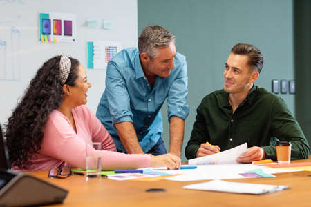 Businessman explaining business strategy to multiracial colleagues in meeting at creative office. Unaltered, creative business, workplace, discussion, diversity, planning, meeting.