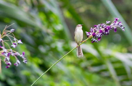 Plain Prinia or White-browed Prinia with blur green background