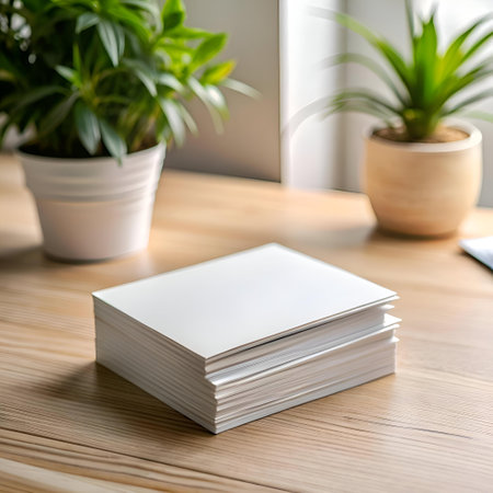A clean and simple image of a stack of white blank cards on a wooden desk. Perfect for showcasing your branding. designs. or creating a minimalist aesthetic.