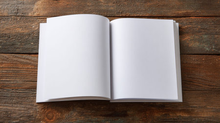 Blank pages of an open book on rustic wooden table, perfect for designs, layouts, mockups, or creative projects in various artistic fields and education