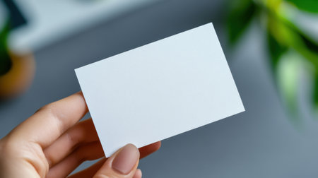 Woman hand holding Blank business card for mock up, present over Dark Blue Grunge background
