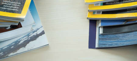 top view of pile of different tabloid magazines on surface