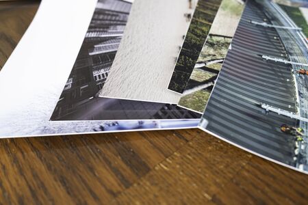 Minimal background composition of printed photographs and laptop on textured wooden desk, photographers office, copy space
