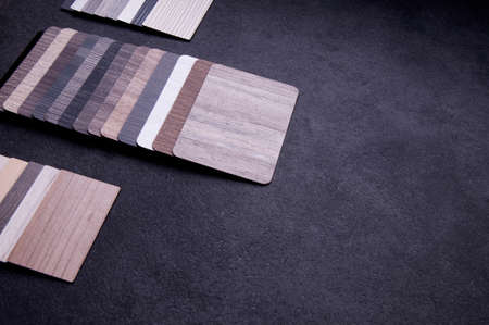 Materials Concept. Top view of wood laminate materials on wooden floor. Interior materials design for home and renovation building. Surface Color Texture of laminate; veneer; parquet; plywood and vinyl floor for Interior designer. Wallpaper for furniture background.