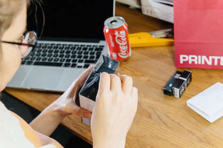 Woman unboxing unpacking new Perfume box luxury French Diptique brand on her working table