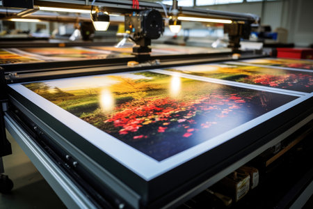 Colors burst forth from the printing machine as sheets filled with vivid images roll out in a bustling workshop. Advanced technology captures artistic designs in dynamic detail.
