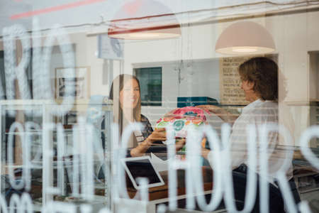 Saleswoman is helping a customer choosing clothes in a boutique with wooden furniture