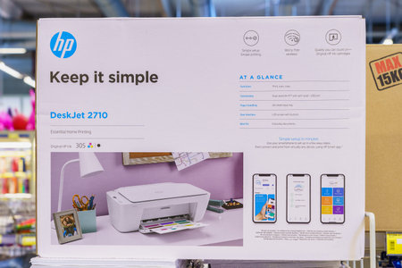 HP office printer on a store shelf. Illustrative editorial. February 2, 2022 Balti Moldova
