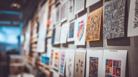 A dynamic display of colorful prints and artistic designs hangs on a gallery wall, illuminated by soft lighting, creating a contemporary and inviting atmosphere for art lovers.
