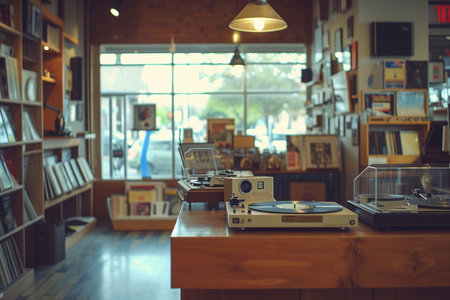 retro store with vintage-inspired signage, tall shelves filled with memorabilia, and vinyl records on display, created with generative ai