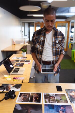 Front view of handsome mixed race male graphic designer using digital tablet at desk in office. This is a casual creative start-up business office for a diverse team