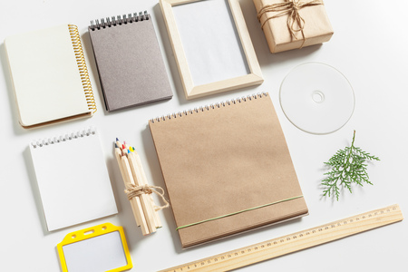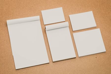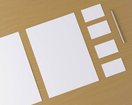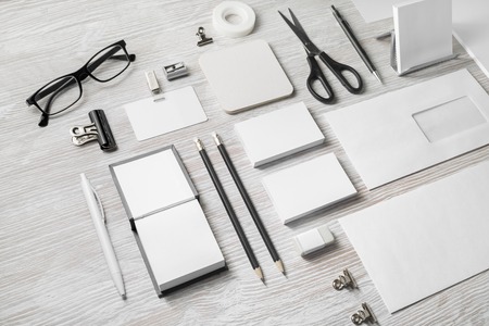 Blank corporate stationery. Template for branding design. Corporate identity set light wooden background.