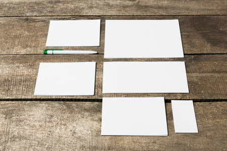 Various blank cards and a pen arranged on a wooden table surface