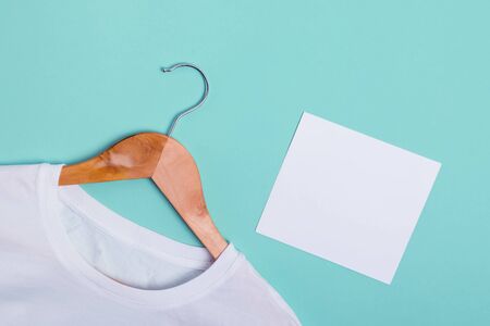 White t-shirt lying on green turquoise background and blank paper card