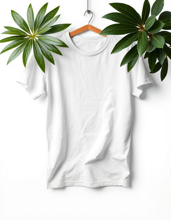 White t-shirt mockup on wood hanger with tropical leaves