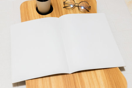 Opened white blank magazine on the top of a brown wooden table for mockup