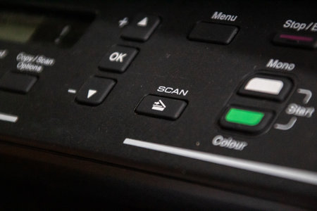 Close-up of a printer control panel with a scan button highlighted for office equipment and document management workflows