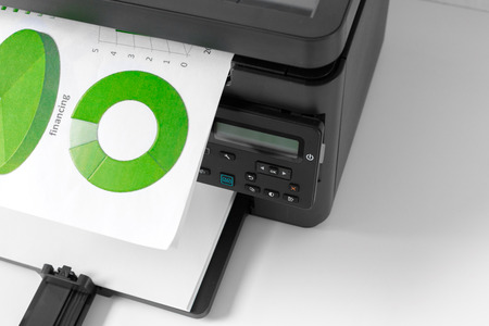 Office digital printer, copier and paper on wooden desk, fax machine close-up modern