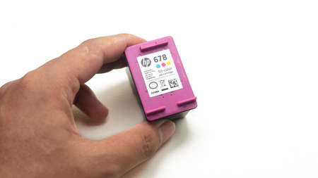Sungai Buloh, Malaysia - Disember 2, 2020: Hand holding a HP 678 Original Tri-color Ink Cartridge for printer on isolated white background.