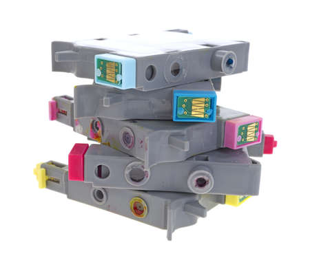 A jumbled stack of empty inkjet printer cartridges on a white background