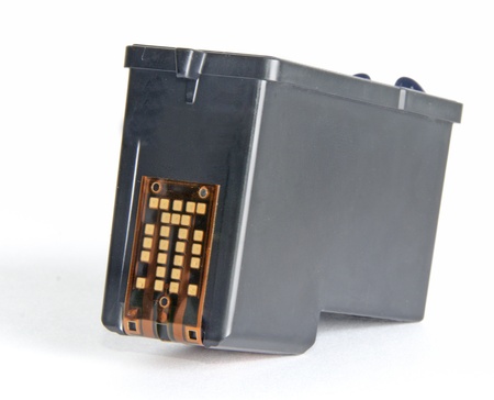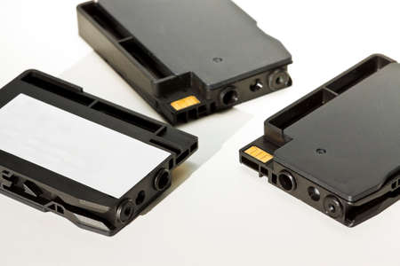 Black plastic inkjet cartridges with white label for text insertion
