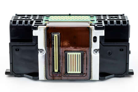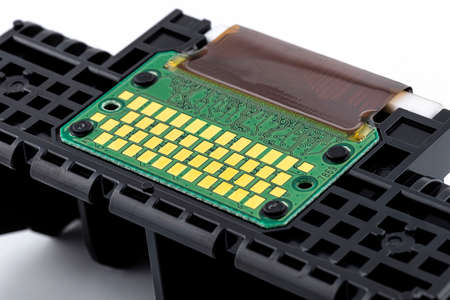 A close-up shot of the printing nozzles and electrical contacts in the inkjet printer head, isolated on a white background.