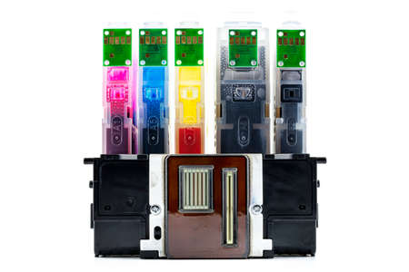 A close-up shot of a printer head and ink cartridges inserted into it, isolated on a white background.