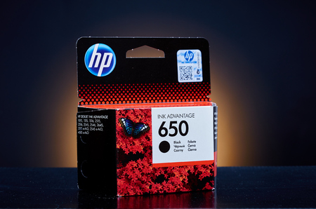 Umag, Croatia - 28 October 2015: Packet of Hewlett Packard 650 BK ink for a ink jet printer