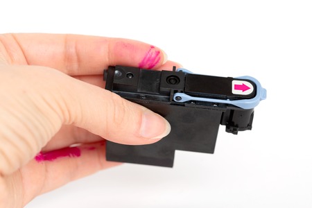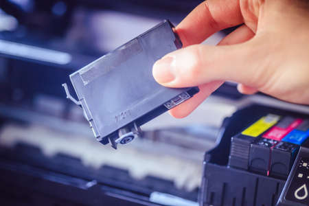 Putting new printer cartridge into the printer, inkjet.