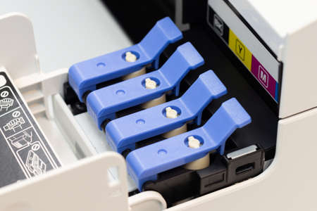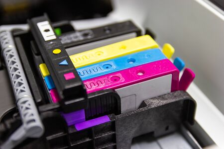 Row of inkjet printer CMYK cartridges - cyan, magenta, yellow, key or black colors - close up view.
