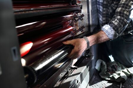 Traditional offset press. Printing in ink with CMYK, cyan, magenta, yellow and black. Graphic arts, offset printing. Detail of printing roller in offset machine of four bodies of black ink