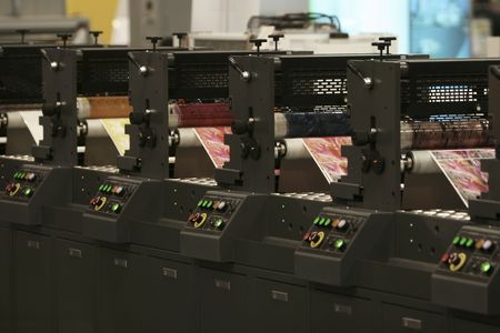 Detailed close up of newspapers being printed on a press machine in a professional printing factory