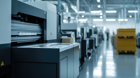 A high-tech printing press is displayed in a modern industrial print factory. Bright lighting illuminates the spacious workspace filled with advanced equipment and machinery.