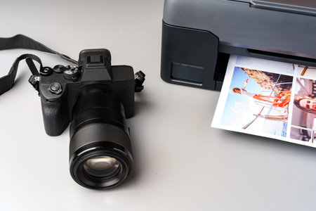 Office digital printer, copier and paper on wooden desk, fax machine close-up modern