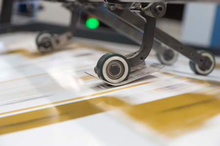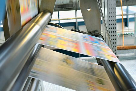 Detailed close up of newspapers being printed on a press machine in a professional printing factory